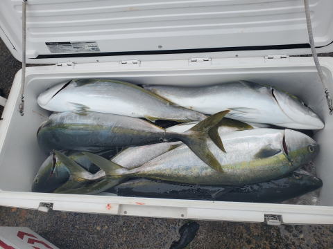 | 4月2日 ジギング便3名様ご案内で出船 皆さん良形ブリを多数キャッチ! ご乗船ありがとうございます。 |